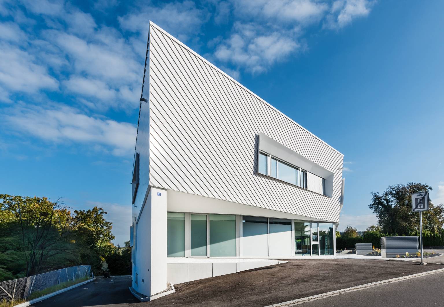 Mit einer markanten Geometrie und einer keramischen TONALITY®-Designfassade von Leipfinger-Bader setzt die neue Wohn- und Gewerbeimmobilie „Polygon“ in Bottighofen (Schweiz) neue architektonische Akzente am Bodensee. Der Neubau umfasst drei Privatwohnungen und fünf Gewerbeflächen. Die auffällige Fassadenkeramik macht das „Polygon“ zu einem unverwechselbaren Blickfang in der Umgebung. Die weiß-glänzenden Keramikelemente wurden in kleinteiligen Segmenten zugeschnitten und bewusst in einer scheinbar zufälligen Struktur angeordnet. Die Fassade wirkt damit lebendig, abwechslungsreich und doch einheitlich. Zudem ist sie praktisch wartungsfrei und wird über Jahrzehnte ihre Ausstrahlung behalten. Weitere Besonderheit: Die Befestigungshaken des ADS-Profils verfügen über verschiedene Einbautiefen, so dass die unverwechselbare Stülpoptik zur Geltung kommt.