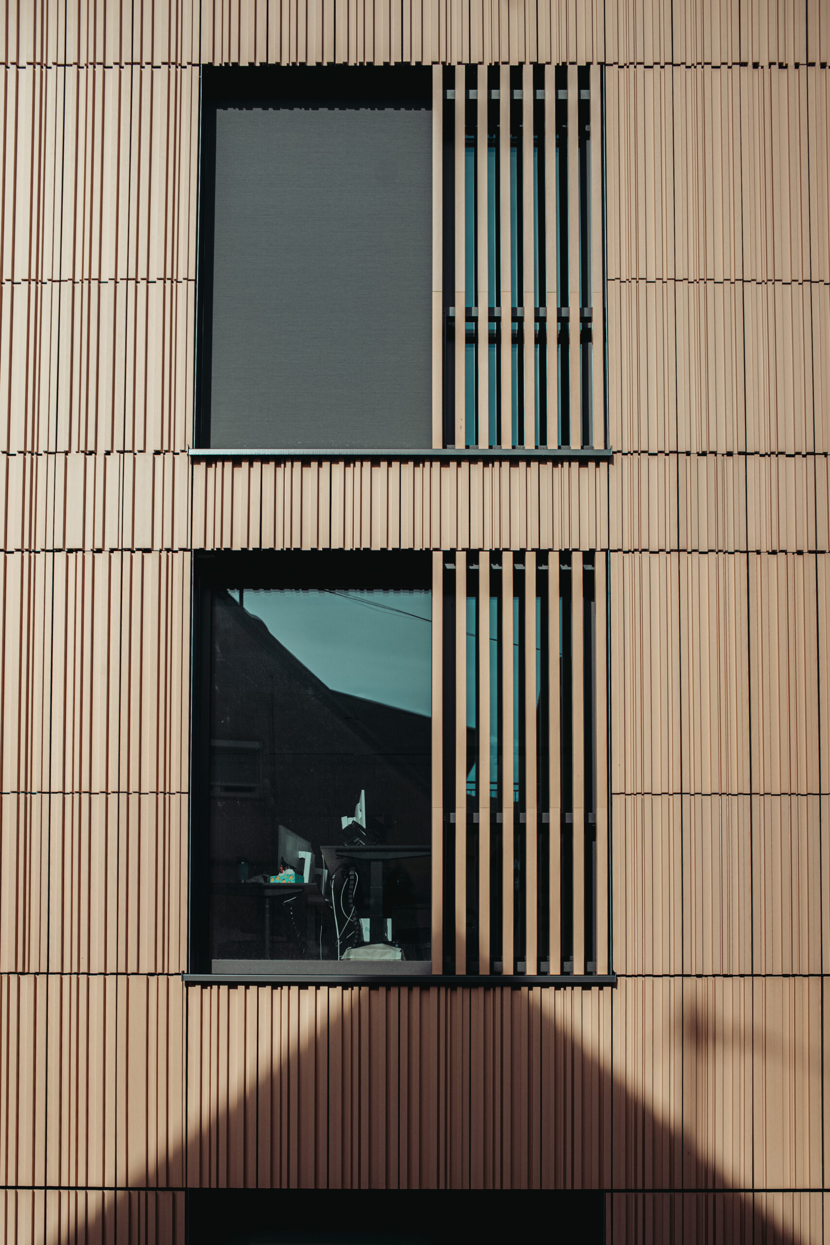 Vor die Fenster gesetzt: Die keramischen Baguettes fungieren an dieser Stelle als Designelement nach außen. Sie lassen dennoch viel Licht ins Innere und verursachen im Raum ein spannendes Licht-Schatten-Spiel. @ buero-magma.com