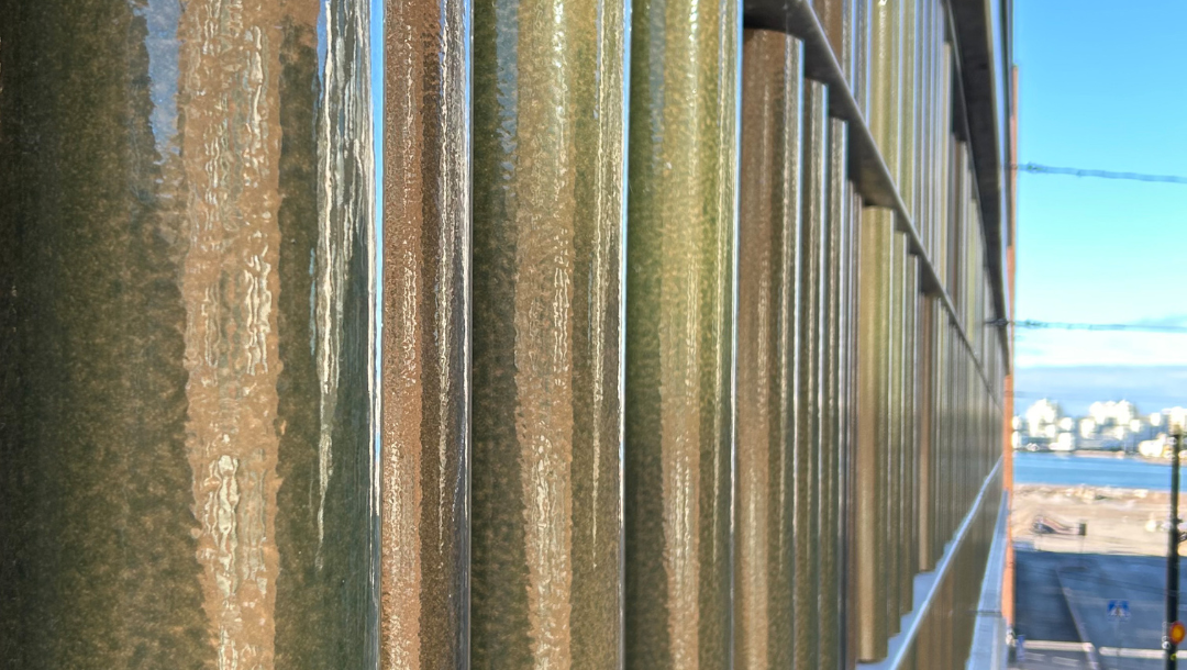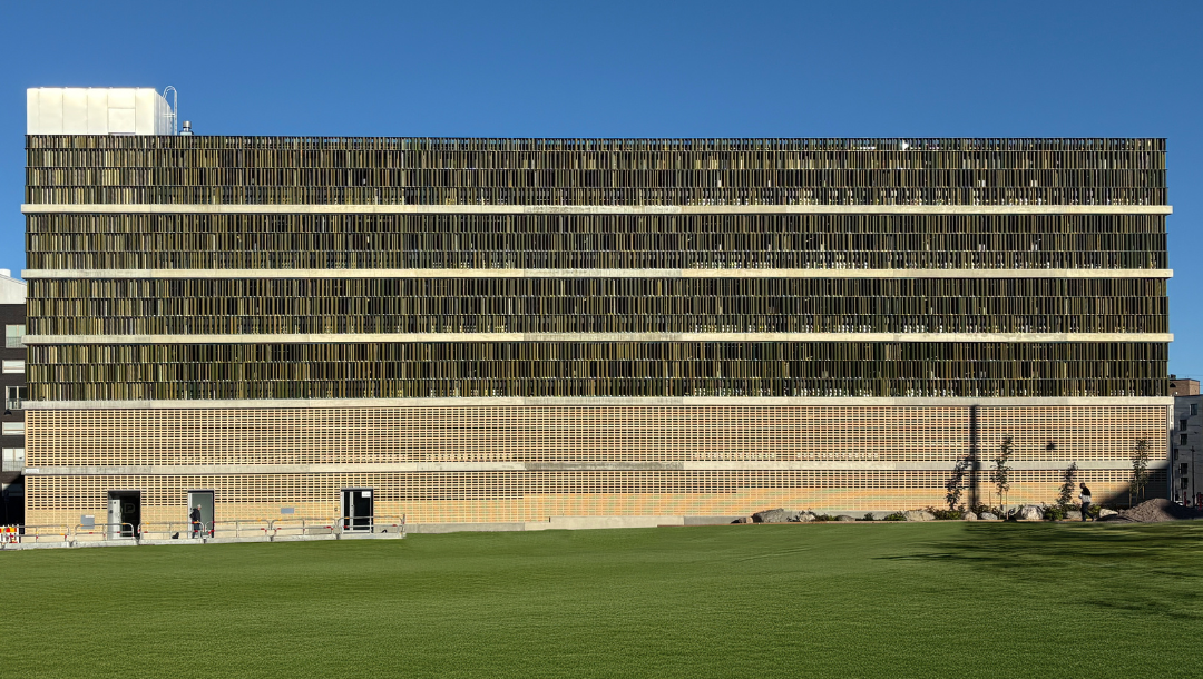 Die Fassade des Gebäudes wurde mit TONALITY®‑Keramikelementen gestaltet. Drei fein aufeinander abgestimmte Grüntöne der sogenannten Tubes verleihen der klaren Struktur eine natürliche, organische Tiefe. Zugleich sorgt die offene Anordnung der Tubes mit ihren durchscheinenden Bereichen für eine lichtdurchflutete Wirkung und ermöglicht dem Parkhaus eine transparente, einladende Präsenz im Stadtbild.