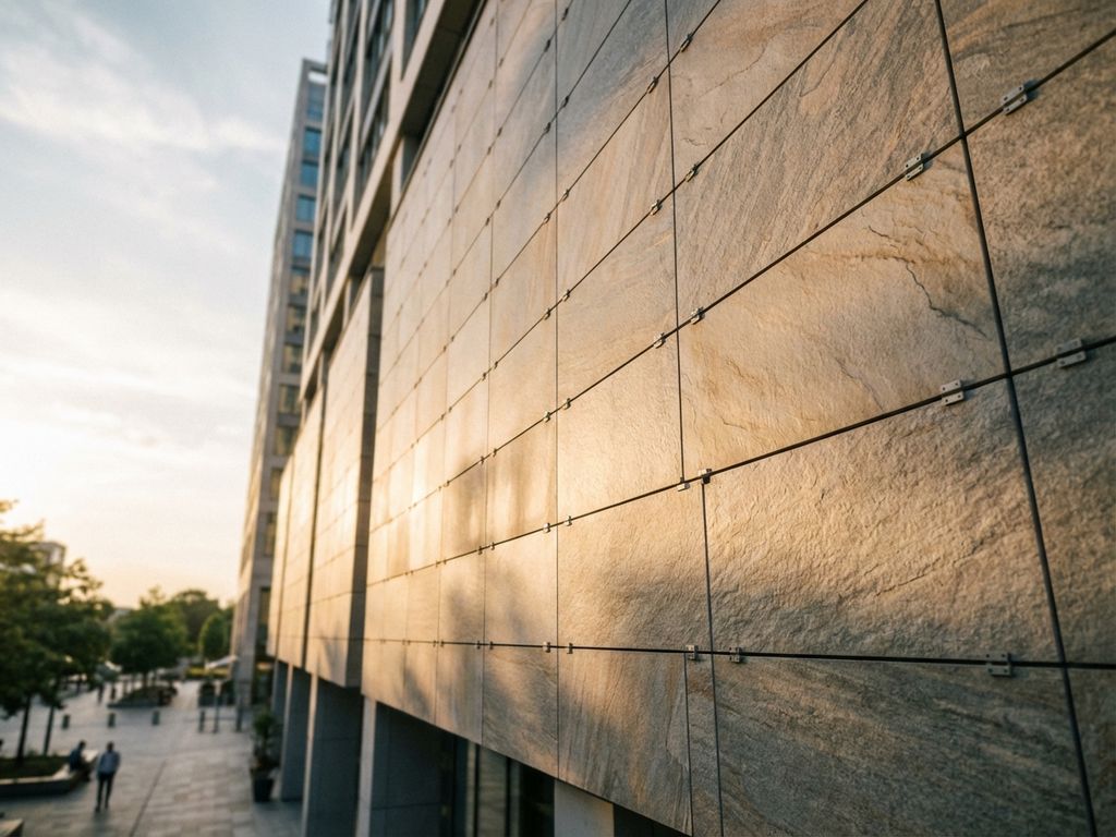 Modern office building exterior with large ceramic facade panels featuring natural stone-like texture in golden hour lighting.