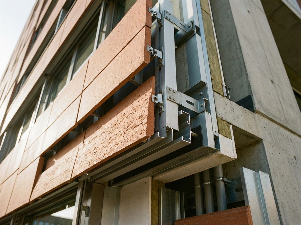 Key components include aluminium support rails mounted to the substrate, specialised clips that engage with profiled panel backs, and a continuous ventilated cavity. This creates a rainscreen system in which the outer ceramic layer provides weather protection while the inner cavity manages moisture and thermal movement.
